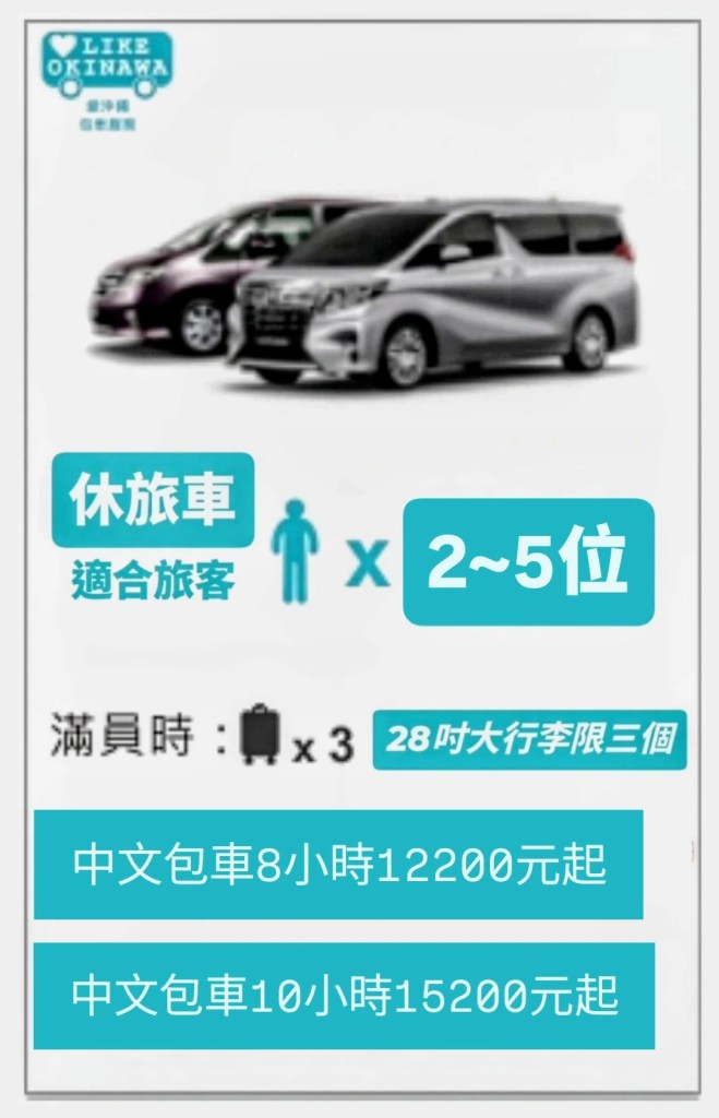 一、合法車輛與服務性質說明【愛沖縄】包車服務所提供之車輛,皆為沖繩地區合法營運之客運車輛或個人營業車,司機與車輛均持有日本國土交通省核發之營業許可(營業綠牌),屬合法營業車輛,旅客依法享有相關保障。