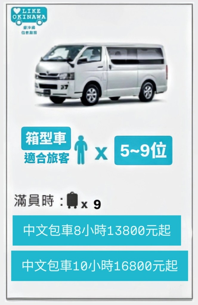- 愛沖繩- 我們採用的車輛均為日本交通省認可頒發(營業綠牌),讓旅客擁有完整保障。